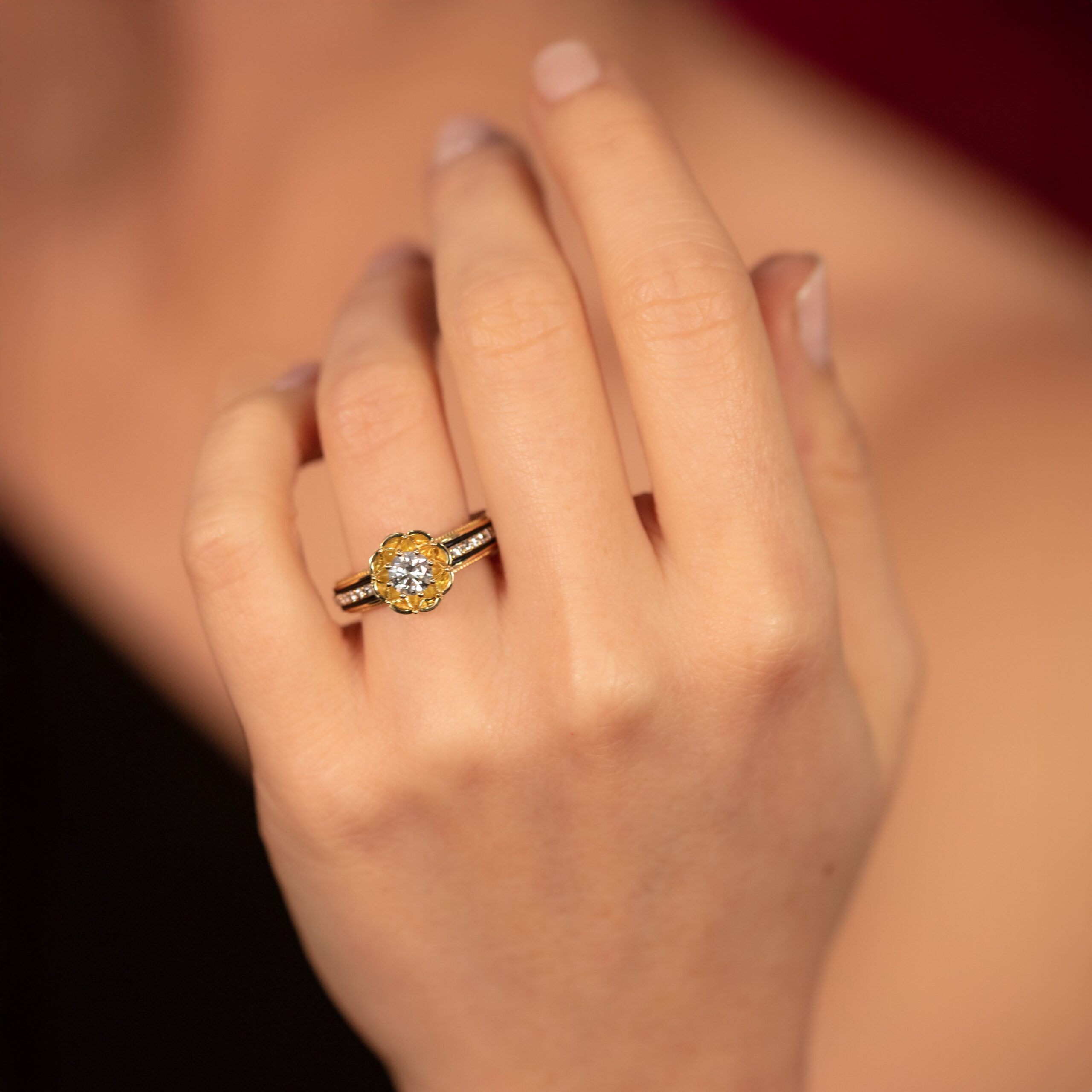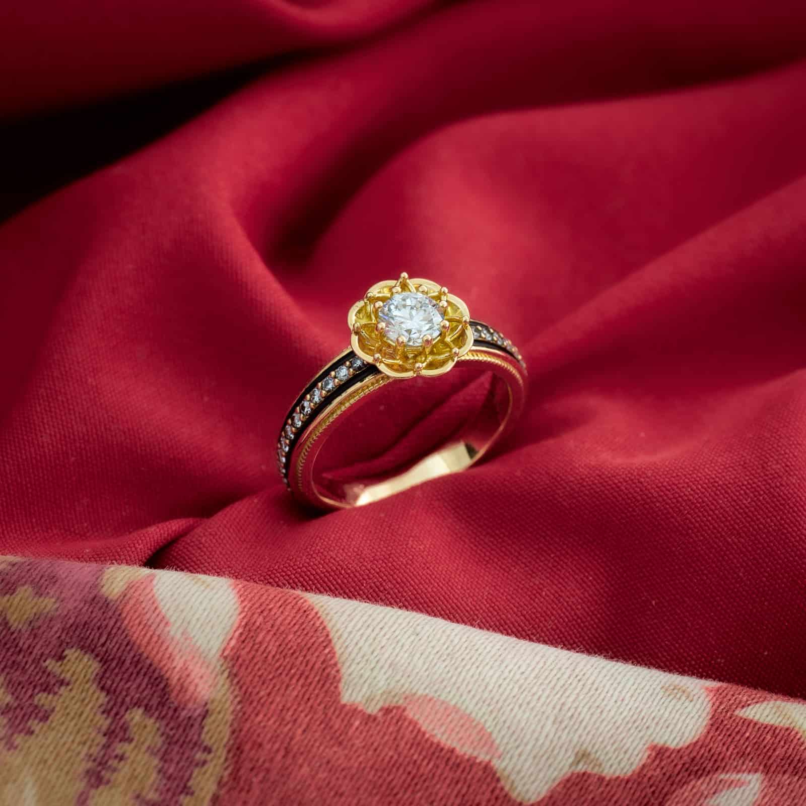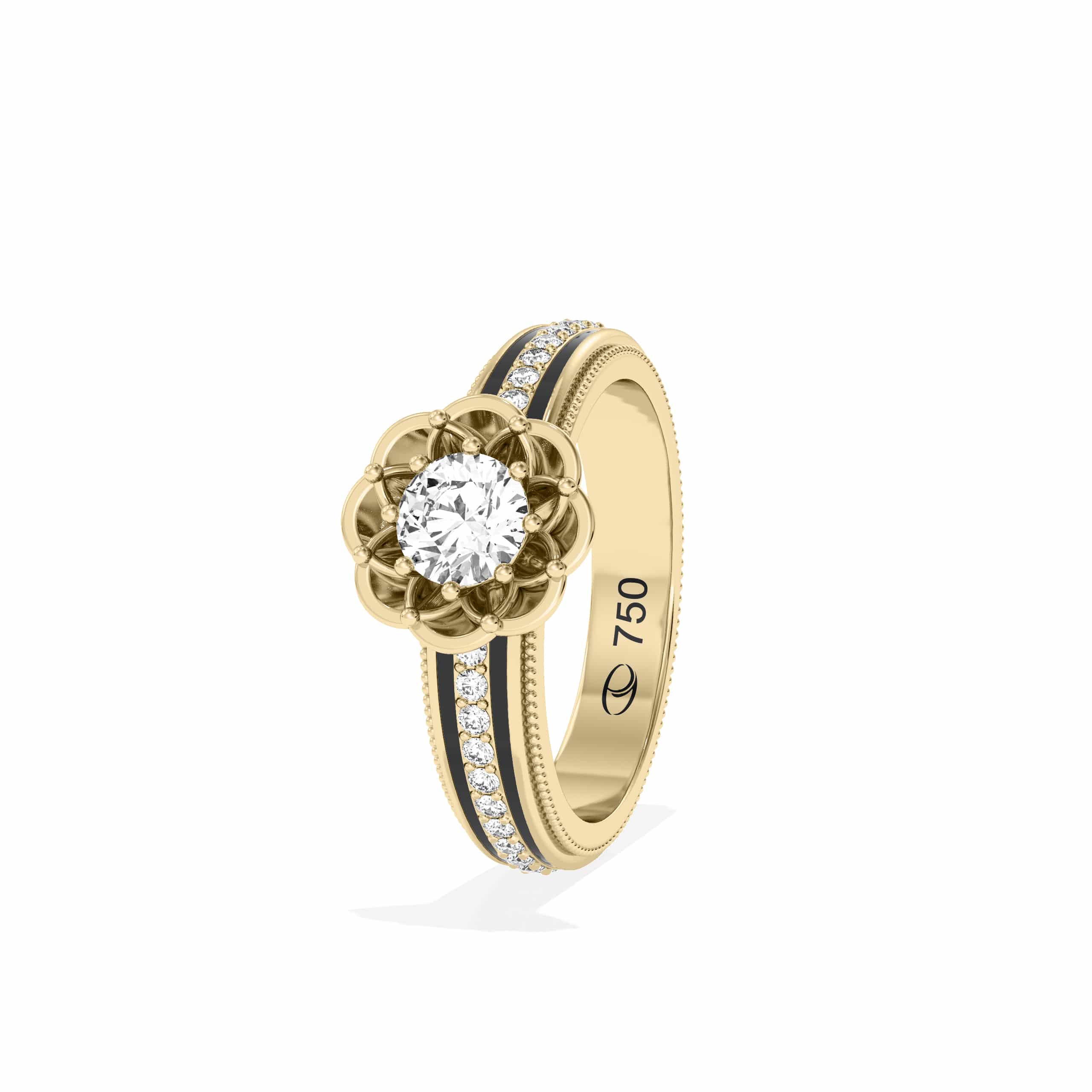 Inspirée des bijoux de l’époque Napoléon III, cette bague en or jaune 18 carats 750 célèbre la splendeur d’Eugénie de Montijo. Sur un décor noir profond, des perles d’or finement miligrainées se déploient sur la monture, dessinant un délicat motif floral. Des diamants naturels modernes (0,50 ct, qualité D) y projettent une lumière éclatante, mêlant l’élégance romantique du Second Empire à la brillance joaillière contemporaine.