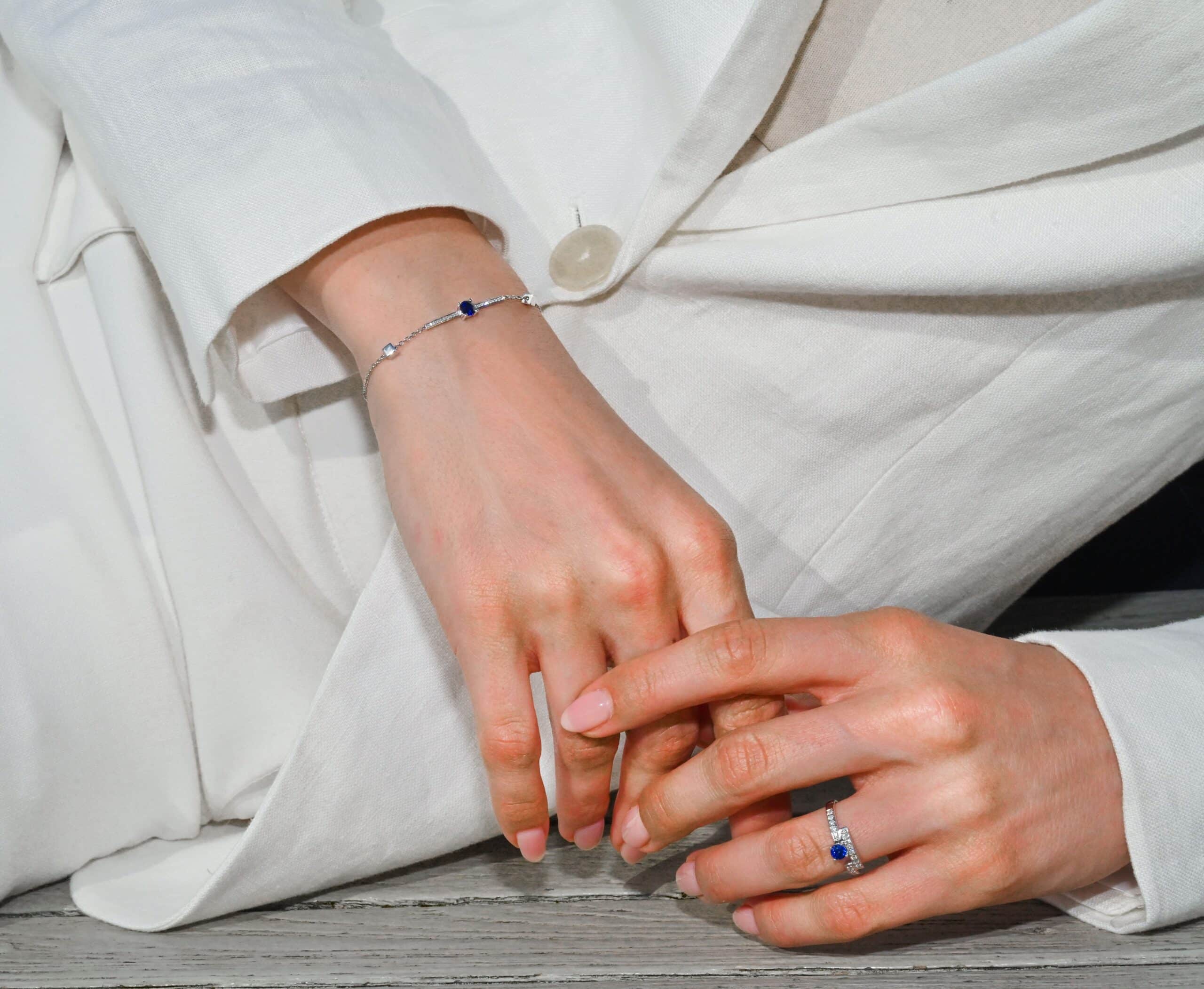 La linéarité inspire confiance et équilibre. Ce bracelet en platine 950 s’étire dans une élégance maîtrisée, ponctuée de diamants naturels (0,06 carat) et d’un saphir bleu de Ceylan de 0,35 ct. Ensemble, ils composent une structure sobre et lumineuse, symbole de constance et de raffinement.